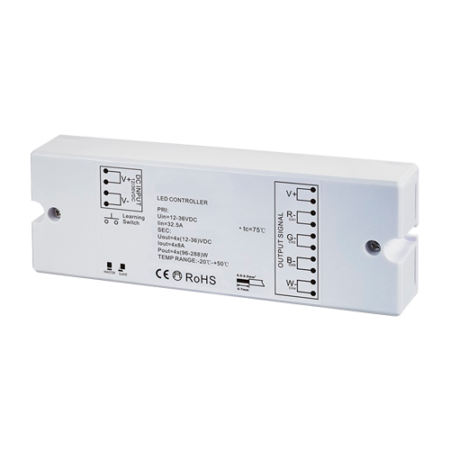 Controlador / Receptor inalámbrico RGBW para el control a distancia de tiras de LED. Trabaja con diferentes emisores y transmisores WiFi. Permite controlar RGBW, RGB, CC-CW e iluminación LED de un solo color. Cada receptor se puede conectar a 8 controladores remotos diferentes como máximo.